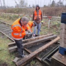 Nachdem wir uns mit der Pflasterei im Vormonat leicht verausgabt haben, konnten wir uns wieder anderen Dingen zuwenden. Der Jung-Rangiertraktor unseres Vereinskollegen hat nur endlich wieder seine Puffer zurück, was das Verschieben des Fahrzeugs deutlich vereinfacht. Auf dem ehemaligen Fundament des Schlackekrans findet sich nun ein kurzes Gleisjoch, bereit zur Aufnahme des 01-Radsatzes. Unterdessen konnte auch der Packwagen weitestgehend von Müll befreit und eines der zerstörten Fenster erneuert werden.